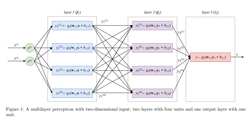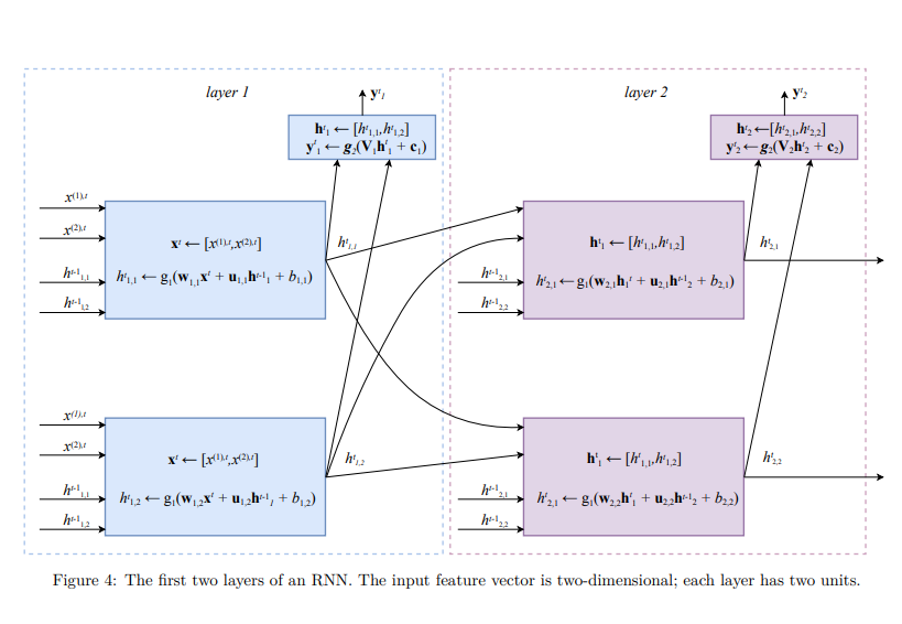 In an RNN, the input example is “read” by the neural network one feature vector at a timestep. The index denotes a timestep. To update the state at each timestep in each unit u of each layer we first calculate a linear combination of the input feature vector with the state vector of this same layer from the previous timestep, . The linear combination of two vectors is calculated using two parameter vectors and a parameter . The value of is then obtained by applying an activation function g1 to the result of the linear combination. A typical choice for function is . The output is typically a vector calculated for the whole layer at once. To obtain , we use an activation function that takes a vector as input and returns a different vector values calculated using a parameter matrix and the parameter vector . A typical choice for is the softmaxfunction.