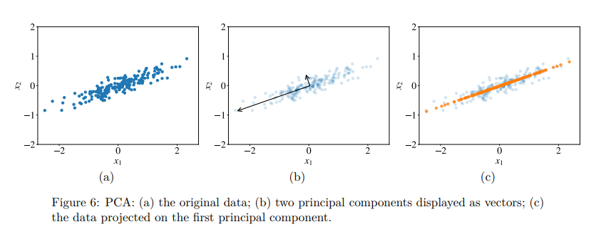 Consider a two-dimensional data as shown in fig. 6a. Principal components are vectors that define a new coordinate system in which the first axis goes in the direction of the highest variance in the data. The second axis is orthogonal to the first one and goes in the direction of the second highest variance in the data. If our data was three-dimensional, the third axis would be orthogonal to both the first and the second axes and go in the direction of the third highest variance, and so on. In fig. 6b, the two principal components are shown as arrows. The length of the arrow reflects the variance in this direction. Now, if we want to reduce the dimensionality of our data to